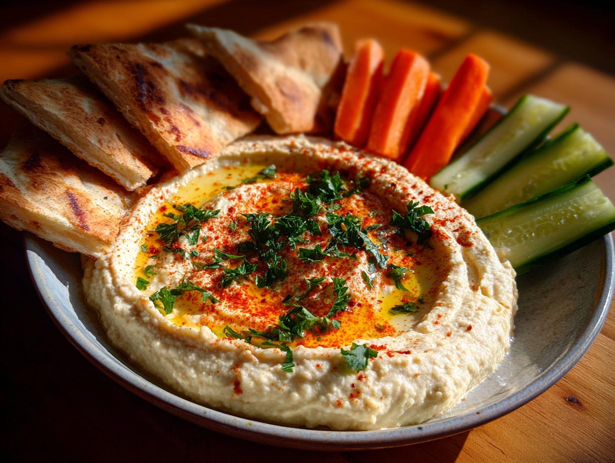 A smooth and creamy hummus served with warm pita bread and fresh vegetables. Perfect for sharing as an appetizer or snack.