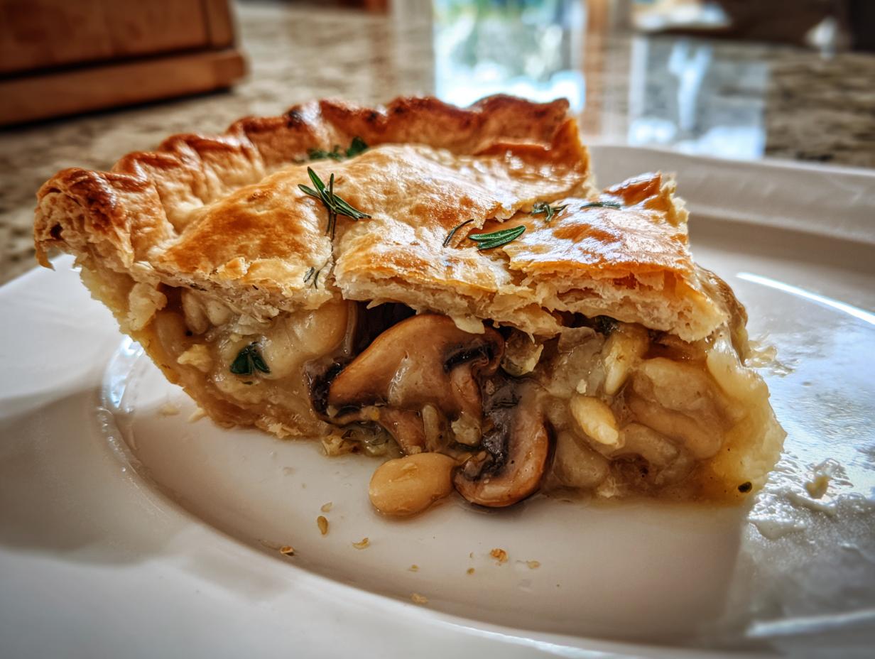 A hearty vegan pot pie filled with mushrooms and white beans in a creamy sauce, topped with a flaky crust.