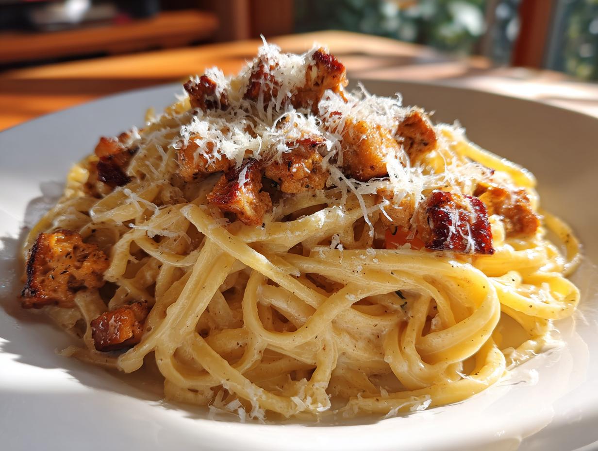 A classic Italian pasta dish made with eggs, cheese, and traditionally bacon. This vegetarian version swaps bacon for smoked tempeh, keeping the rich and creamy texture.